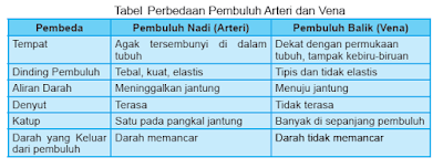 Pembuluh darah dibedakan menjadi dua, yaitu pembuluh nadi (arteri) dan pembuluh balik (vena). Arteri merupakan pembuluh darah yang mengalirkan darah keluar jantung, sedangkan vena mengalirkan darah masuk ke dalam jantung. Arteri berisi darah yang mengandung banyak oksigen, kecuali arteri paru-paru. Vena berisi darah yang mengandung sedikit oksigen, kecuali yang berasal dari paru-paru.Ujung arteri dan vena bercabangcabang menjadi pembuluh-pembuluh kecil yang disebut pembuluh kapiler. Pembuluh kapiler menghubungkan arteri dan vena dengan sel-sel tubuh.